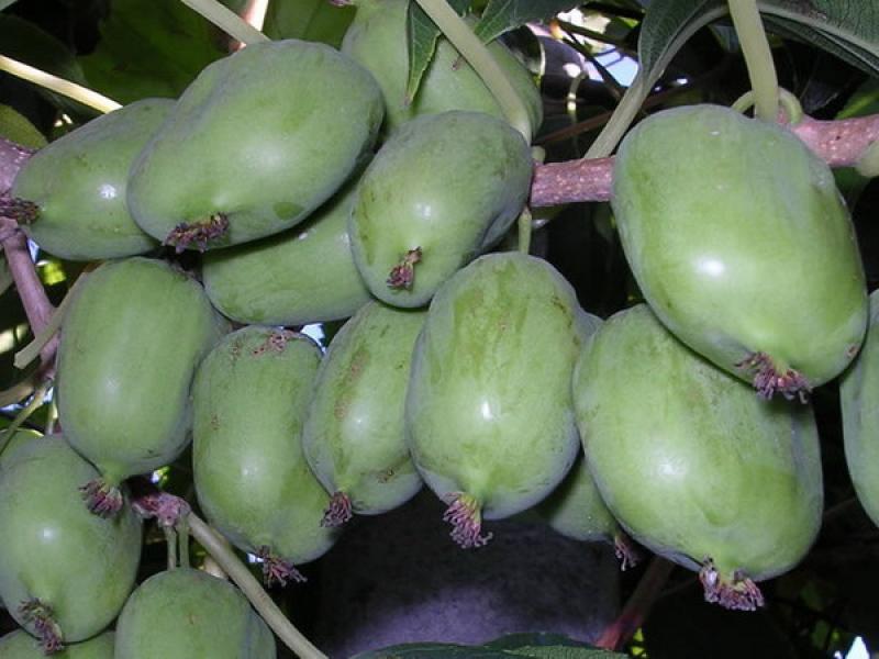 Актинидия Киевская крупноплодная - ягода до 19 г, плодовые растения с вкусными, нежными, ароматными плодами, по внешнему виду похожи на киви, зеленого цвета по вкусу - киви и сладкий крыжовник. Срок созревания сентябрь - август. Начало плодоношения на 3 год. Урожайность 10-12 кг/куст. Лиана до 20 м, растение зимостойкое.