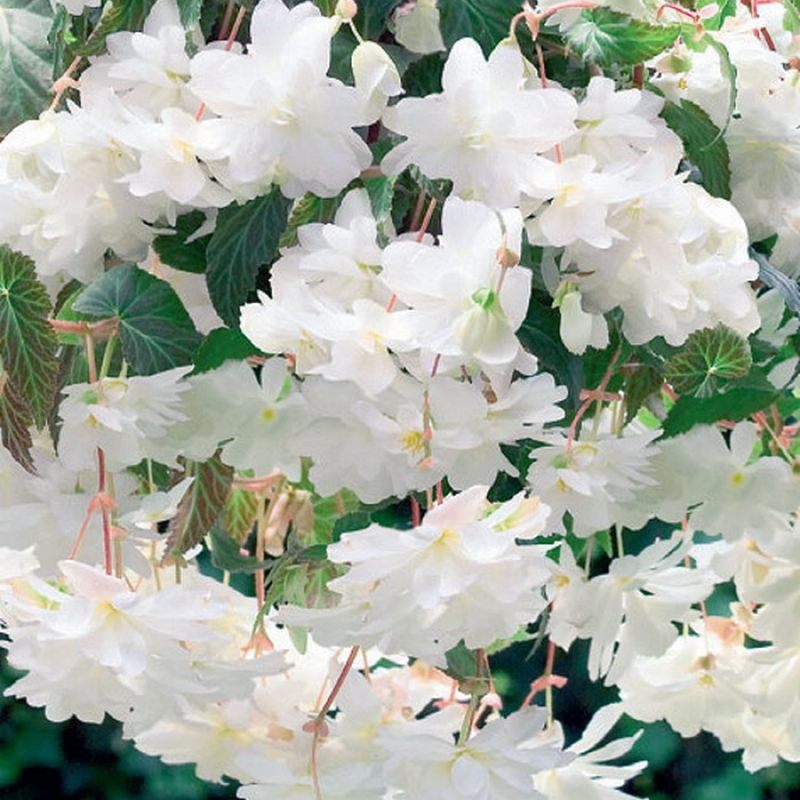 Изящные стебли этой ампельной бегонии с каскадом махровых цветков и многочисленными новыми белыми бутонами все лето и осень великолепно смотрятся в настенных кашпо, подвесных корзинах, горшках на цветочных подставках и полках. Размер цветков 6-8 см. Семена или гранулы высевают с декабря по март, поверхностно, во влажный субстрат. Прорастание на 7-14 день при оптимальной температуре 23...25 С. Через 6 недель пикировка и первая подкормка азотным удобрением. Спустя 11 недель пересадка: одиночные растения - в горшки диаметром 10 см, по 3-5 растений - в горшки диаметром 25, по 3-5 растений - в корзины диаметром 30 см. Выращивание при температуре 20 С. С момента прорастания и до середины марта растениям необходимо обеспечить 14-часовой световой день. Рекомендуется еженедельная подкормка азотными удобрениями для лучшего развития корневой системы. Молодые растения необходимо притенять от прямых солнечных лучей. Короткий день и температура ниже +16 С способствуют клубнеобразованию, но задерживают начало цветения.