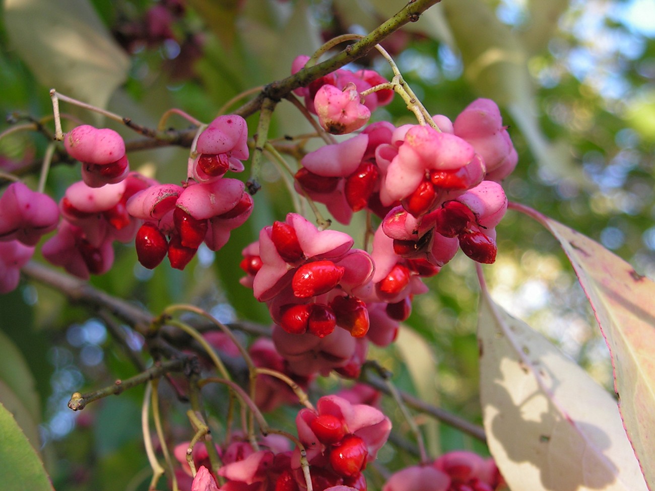 Бересклет Маака – листопадный кустарник, который достигает высоты до 2 метров. Отличается хорошей зимостойкостью и является самым красивым из всех листопадных бересклетов.Его гамма – розовая. В этот цвет окрашиваются осенью и его плоды, и листва, которая летом бывает светло-зеленой, без сизого оттенка. Листья могут быть до 12 см длиной и 8 см шириной, блестящие, продолговатые. Цветки с лепестками до 5 мм в длину и 2,5 мм в ширину собираются в соцветия по 5-7 штук. Цветение начинается у Маака позже, чем у других видов - в конце июня-начале июля. Постепенно куст отцветает и становится полностью розовым. Любит слабокислую, слабощелочную почву, полутень и умеренную влагу. Если куст окажется под прямыми солнечными лучами, то в жару его нужно будет опрыскивать, обливать.