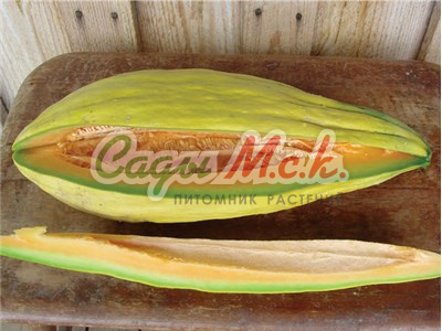Среднеспелый (77-95 дней от всходов до плодоношения) сорт. Растение среднего размера, длинноплетистое. Предназначен для выращивания в пленочных теплицах. Посев на рассаду в конце апреля. Высадка рассады в конце мая – начале июня в возрасте 30-35 дней. В южных регионах выращивают в открытом грунте прямым посевом в апреле-мае. Схема посадки 70х150 см. Растения подвязывают к шпалере, до высоты 50 см удаляют все боковые побеги, последующие прищипывают над 1-3 листом. Полив умеренный, особенно в период плодоношения. На растении образуется 2-3 плода. Плод шаровидный и некрупный, массой 0.7-1.3 кг. Поверхность плода гладкая, желто-оранжевого цвета, без рисунка. Кора средней толщины, гибкая, твердая. Мякоть белая, тонкая, волокнистая, плотная, полухрустящая, сочная, сладкая. Семенное среднего размера. Относительно устойчив к бактериозу, в сильной степени поражается мучнистой росой и антракнозом. Ценность сорта: хорошая транспортабельность плодов. Урожайность одного растения 1,4-3,9 кг.