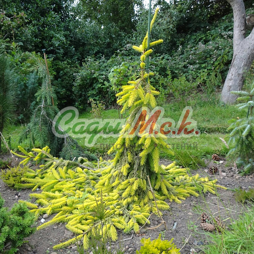 Золотая ель плакучей формы, годовой прирост около 15-20 см. К десяти годам высота составляет 150-180 см. Молодая хвоя ярко-зеленого цвета, затем желтого. Молодому растению необходимо ставить опору, или выращивать как почвопокровное растение. Морозостойкость -40С.