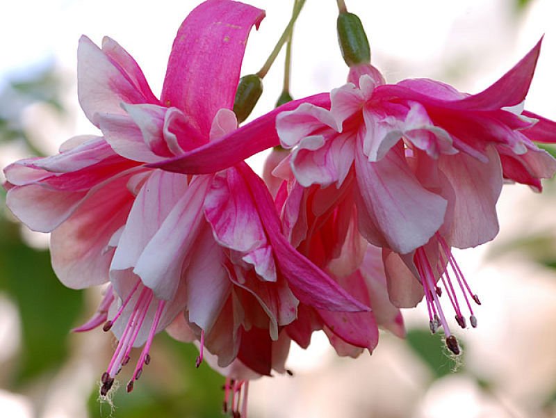 Фуксия Кей Райли - рослая полуампельная фуксия с огромными цветами и крупными листьями. Чашелистики нежно-розовые. Многослойная пышная юбочка из ярко-розовой у основания плавно переходит в белую с красными прожилками. Очень красивый сорт среди розовых фуксий.