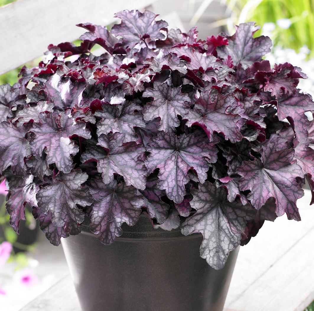 Гейхера гибридная Блэкберри Джем (Blackberry Jam ) – элегантное растение с пурпурно-фиолетовыми гофрированными листьями и чёрными или тёмно-фиолетовыми прожилками. За своеобразный окрас селекционеры и дали название растению «Черничный Джем». Гейхера неприхотлива, семена и рассада растут на любых почвах. Однако надо следить, чтобы не было переизбытка влаги в почве, чтобы корни растения не запревали. Лучшее место для посадки – лёгкая полутень. Характеристика сорта Гейхеры гибридной Блэкберри Джем: многолетний куст; высота: 25-30 см; период цветения: июнь, июль, август; окрас цветов: бело-коралловые.