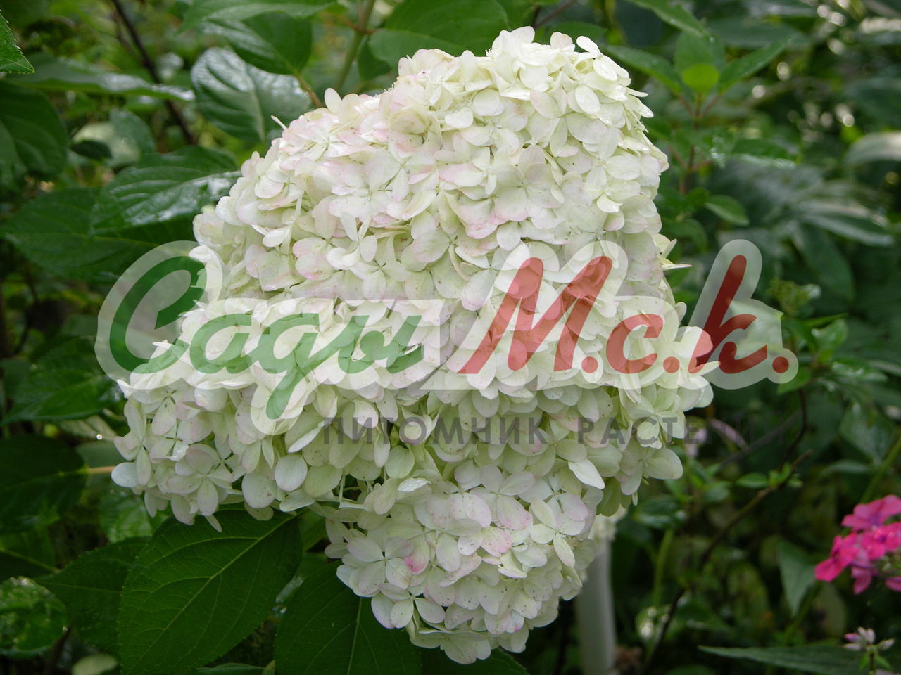 Саженцы гортензии метельчатой Mega Mindy популярны среди садоводов-любителей. Этот кустарник быстрорастущий, с прочными ветвями, легко выдерживающими тяжесть соцветий, а соцветия одни из самых крупных, среди гортензиевых. Кистевидные соцветия этого сорта достигают 30 см в длину. Цветы Mega Mindy имеют белый цвет, но быстро приобретают довольно необычный красно – розовый оттенок. Крепкие побеги кустарника, также, имеют красноватый окрас. Листья темно–зеленые, супротивно расположенные, около 10 см в длину. Крупномер Mega Mindy часто применяется в создании композиций, особенно с хвойными и другими вечнозелеными декоративными растениями.