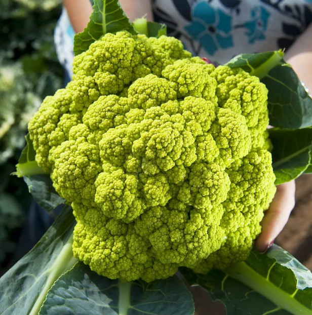Капуста цветная Green Trevi - "зеленый" сорт. Головка необычной, слегка округлой формы, с бугорками, окружена большими темно-зелеными покрывными листьями. Окрас соцветия насыщенно-зеленый, однотонный.