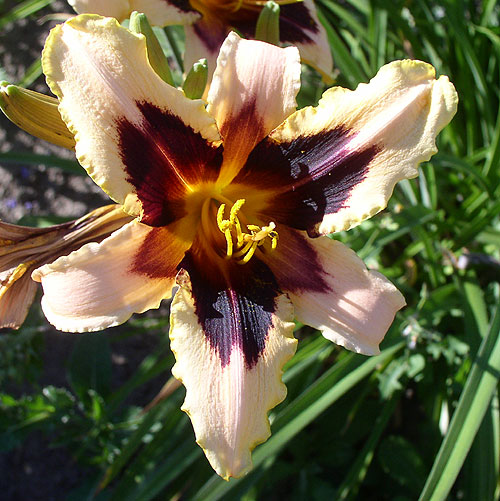 Лилейник Wild Hоrsеs – красивое многолетнее корневищное растение, во взрослом возрасте достигающее метровой высоты. Сорт очень эффектен, не только благодаря своему необычному росту, но и огромным, чисто-кремовым цветам. Каждый цветок – это уникальное творение со слегка волнистыми по краю, загнутыми лепестками и бархатистым черно-пурпурным гало вокруг светящегося золотистого центра. Обильное цветение начинается в июле и в особо благоприятную погоду может продолжаться до двух месяцев. Это садовое растение абсолютно не претендует на особое внимание со стороны садоводов. Оно предпочитает солнечные, открытые места, но с легкостью может мириться и с небольшим затенением, хотя цветение при этом будет менее обильным. Сорт хорошо переносит зимовку и не требует укрытия.