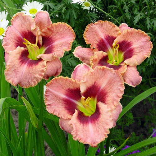 Лилейник Daring Deception - долгоцветущий, крупноцветковый сорт. Высота растения - 60 см; диаметр цветка - 13 см. Цветет в средний период (конец июля), повторноцветущий и зимостойкий сорт. Цветок розово-лавандовый с ярким фиолетовым глазом и узкой такого же цвета каймой на внутренних гофрированных лепестках. Горло ярко-желтое, красиво контрастирует с окраской цветка. Куст лучше растет на полном солнце. Полувечнозеленый, тетраплоид.
