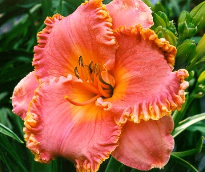 Лилейник Lori Goldston - розово-коралловый цветок с желтым горлышком и золотой каймой на великолепно гофрированных лепестках. Обладает душистым ароматом. Цветки крупные, диаметром 16,5 см. Растение цветет обильно и продолжительно в июле. Листва вечнозеленая. Высота растения - 65 см.
