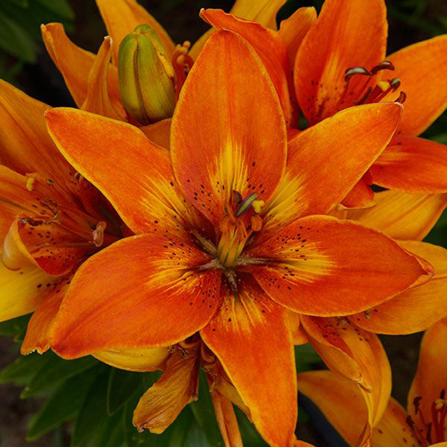 Луковицы азиатской горшечной лилии Бернинг Джой (Lilium asiatiс Burning Joy) привлекают внимание огненной расцветкой. Высота стеблей около 40 см. Цветки крупные, в диаметре достигают 15 см. Окраска оранжево-красная, ближе к центру желтые мазки. Крап коричневатый. Лепестки изящно подогнуты вниз. Сорт может выращиваться в открытом грунте или кашпо. Предпочитает рыхлые, дренированные почвы. Для улучшенной бутонизации рекомендуется размещать на солнце или в полутени. Лилия нуждается в умеренном поливе, но без длительного застоя влаги. При выращивании в горшках Лилие азиатской горшечной Бернинг Джой необходим дренаж.