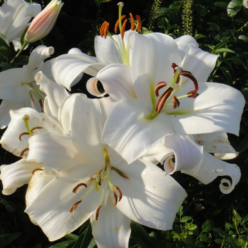 Луковицы лилии ОТ-гибрид Замбези (Lilium OT-hybrid Zambezi) — это роскошный сорт с классическими белыми соцветиями. Взрослое растение достигает 120 см в высоту, имеет прочный стебель и не нуждается в опоре. На одном цветоносе расположены целые букеты крупных (до 20 см в диаметре) цветов. Лепестки белые, а темные пыльники создают эффектный контраст. Лилия Замбези — многолетнее растение. При наличии укрытия она может переносить зиму в открытом грунте, а летом легко выдерживает прямые солнечные лучи. Цветение Лилии ОТ-гибрида Замбези будет особенно пышным, если взрыхлять почву и поддерживать ее влажность, а также подкармливать растение минеральными смесями.