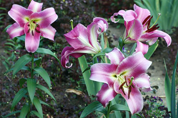 Лилия Purple Lady относится к гибридам. Цветки изумительной красоты, очень крупные, диаметром 25 см, розово-фиолетовые с белым мазком по центру лепестков и зеленоватым горлом. Аромат очень приятный. Цветонос прочный, высотой до 150 см, на одном цветоносе бывает несколько крупных цветков, направленных в стороны и вверх. Цветет эта лилия в июле - августе