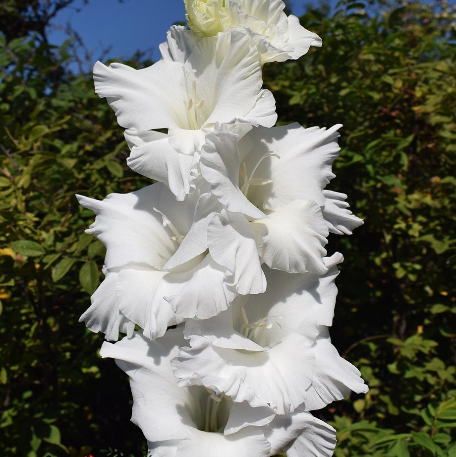 Луковицы гладиолуса крупноцветкового Сноуи Раффл (Snowy Ruffle) дают жизнь поразительной красоты цветку. Огромные, гофрированные белоснежные бутоны дышат чистотой и невинностью. Они наполняют сад свежестью, а идеальную белизну лепестков подчеркивает насыщенная зелень крупных мечевидных листьев. Сорт пригоден для срезки, цветы в букете остаются свежими до 2 недель. Цветочная стрелка гладиолуса возвышается на 120 сантиметров, почти 80 сантиметров ее длины покрыты бутонами. Края лепестков сильно гофрированы, придавая цветку утонченности. Цветение у Гладиолуса гофрированного Сноуи Раффл начинается в июле, а заканчивается с приходом первых заморозков.