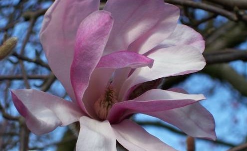 Магнолия Leonard Messel - листопадный широкий, вертикальнорастущий, многоствольный, сильноразветвлённый, крупный кустарник или небольшое дерево с коротким стволом. Высота растения - 3-5 м. Листья расположены очерёдно, обратнояйцевидные, зелёные. Цветение начинается в конце апреля, начале мая на концах ветвей до распускания листьев в большом количестве, отдельные цветы - большие бутоны звездчатой формы, диаметром до 14 см, по 11-13 лепестков, длиной 5,7-7 см и шириной 0,8 -1,5 см, белого или светло - розового цвета, самые крайние лепестки имеют сине-красные или розово-фиолетовые полоски. Цветки изначально чашечковидные, позднее широко открытые, очень эффектные.