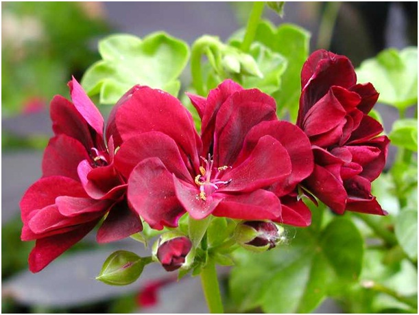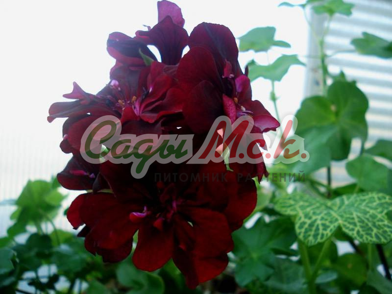 Плющелистная пеларгония Жако - куст с большущими темно-бордовыми, бархатистыми цветами, лепестки интересно изогнуты, из центра идут темные, практически черные, лучи.