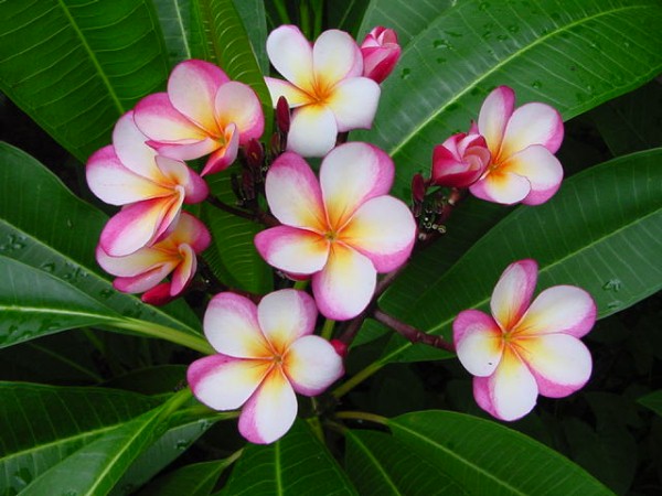 Plumeria Guillots Sunset - маленькое декоративное деревце. Листья огромные, темно-зеленые, гладкие, со светло-зелеными прожилками. Цветки маленькие, светло-розового цвета, почти белые, с розовыми оттенками и желтым основанием. Цветоножки темно-красные. Диаметр цветка - 8 см. Цветки этого сорта обладают мягким ароматом роз.