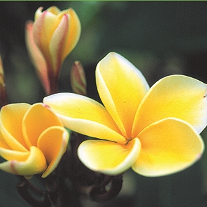 Plumeria Nebels Gold - очень популярный гавайский сорт. Цветок диаметром 9 см, желтый с белой каймой лепестков. На обратной стороне лепестков присутствуют красноватые полосы. Лепестки от эллиптической до обратнояйцевидной формы, с закругленными кончиками. Аромат жасминовый.