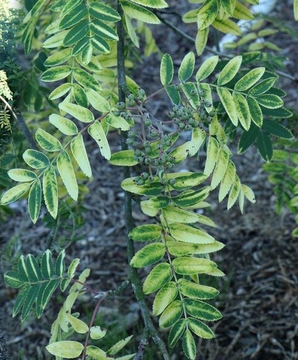 Рябина обыкновенная Пендула Вариегата - это небольшое дерево или крупный кустарник очень редкая форма с поникающими ветвями и золотистопёстрыми листьями. Цветки белые до 1 см, в крупных щитках. Плоды оранжево-красные, шаровидные, долго сохраняются на ветвях, очень украшая дерево ореха. Морозостойка, малотребовательна к почве.