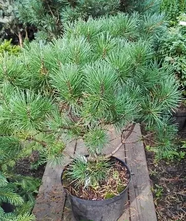 Карликовая закругленная форма, одинаковой ширины и высоты. Высота - 1,5 м и такого же диаметра. Побеги очень короткие. Почки расположены плотно, различной величины, 1 - 2 см длиной, тонкие, коричневые, смолистые. Крона шаровидная. Хвоя на молодых побегах почти прямая, 2 - 4,5 см длиной и до 2 мм шириной, темно-зеленая. Растет медленно и очень густо ветвится. Размножают прививкой
