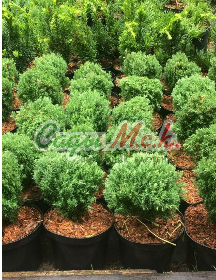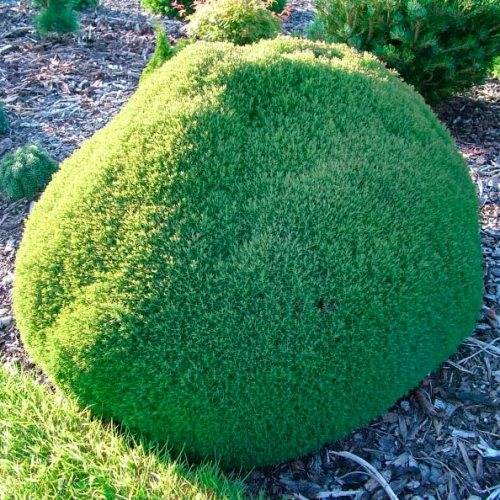 Карликовый подушковидный хвойный кустарник. Крона густая, плотная, побеги тонкие близко расположены к друг другу. Растет очень медленно по 2-3 см год. В 10-летнем возрасте диаметр кроны 0,3 м, позже достигает размеров 0,5 м. Хвоя игольчатая, не колючая, темно-зеленая, зимой становится бурой. Нуждается в плодородной почве, плохо переносит сухость воздуха.