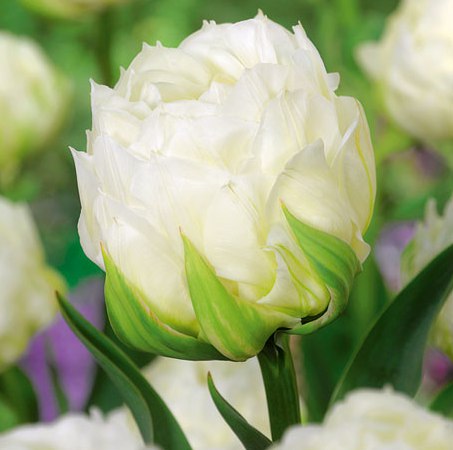 Тюльпан Ice Age - белоснежный, с приятным ароматом, пионовидный, поздний сорт. Высота растения 40-50 см. Листья темно-зеленые. Цветет в мае. Цветок крупный, диаметром- 8-10 см, густомахровый, кремово-белый, со светло-зеленой наружной стороной лепестков, похож на пион. Размер луковицы 11-12 см, диаметр 3,5-4 см.
