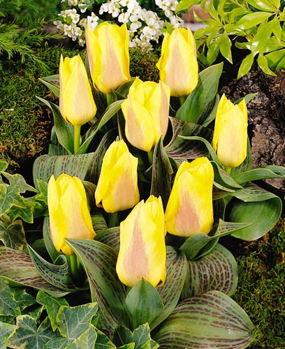 Тюльпан Bella Vista - сорт раннего срока цветения. Первые цветки появляются в марте. Стебли низкие, высотой до 30 см. Листья зеленые с коричневыми штрихами. Цветки желтые с розовым оттенком с внешней стороны лепестков.