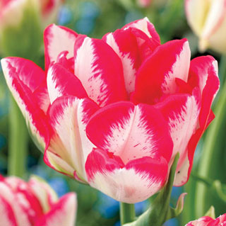 Тюльпан Cartouche - один из лучших поздноцветущих сортов, который относится к классу Махровые поздние тюльпаны.Его полностью махровые цветки очень напоминают пионы. Они состоят из множества больших, взъерошенных лепестков со слегка рассеченными краями. Закрытые цветки имеют белый окрас и незаметную бахрому темно-красного цвета. Тогда, как цветки в раскрытом виде - в ярком двухцветном наряде из малиново-белых лепестков. Размер цветка – до 10 см в диаметре. Продолжительность цветения – две недели и более. Этот сорт обладает приятным ароматом. Рекомендуется для групповых посадок и срезки. Высота растения – около 45 см. Цветет в конце весны.