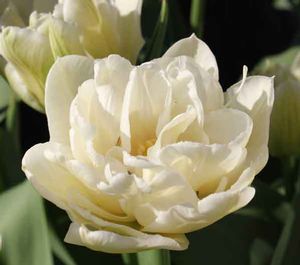 Тюльпан Mondial - красивый, очень нежный тюльпан, который цветет в середине сезона. Цветки белоснежные, с желто-серыми жилками, махровые, хорошо наполненные, слегка ароматные. Они напоминают маленький пион, когда полностью раскрыты. Бутоны – изящной бокаловидной формы. Они возвышаются на невысоких крепких стеблях. Цветки долго не увядают. Размер цветка в раскрытом состоянии – 8-10 см в диаметре. В пик цветения каждый цветок довольно тяжелый. Продолжительность цветения – две недели и более. Чаще всего этот тюльпан выращивают в регулярных посадках на клумбах или в контейнерах. Высота растения - 15-30 см.