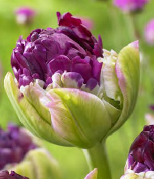 Тюльпан Purple Peony относится к многоцветковым, поздним сортам. Высота растения 45 см. Цветоносы крепкие, с зелеными, по краям осветленными листьями. Цветок крупный, чашевидный, густо-махровый, пионовидный, с множеством лепестков. Бутон, высотой - 8-10 см, диаметром - 6 см, молочно-сиреневый, с пышно-светло-зеленым основанием. Цветет в мае.