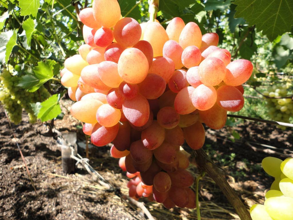 Виноград плодовый Sofia столовая форма винограда раннего срока созревания. Вегетационный период от начала распускания почек до съёмной зрелости ягод 110 – 115 дней. Коронка и верхние молодые листья тёмно-зелёного цвета, без опушения. Лист очень крупный, округлый со слабой рассечённостью, иногда слегка волнистый. Грозди крупные и очень крупные. Ягоды крупные (длиной 28–36 мм, шириной 20–21 мм), розового цвета. Кожица ягоды при еде не ощущается. Мякоть мясисто-сочная, с мускатным ароматом. В самых больших ягодах по 1 – 2 семени.
