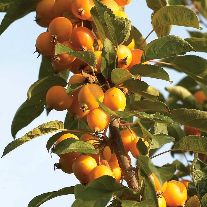 Саженцы яблони декоративной Голден Хорнет из семейства розовых, относятся к декоративным яблоням. Дерево такого сорта очень быстро вырастает, корна формируется густой и широкой. Ветви прямые, листва насыщенного зеленого цвета, осенью они желтеют. Крупномер цветет в мае, его соцветия простые одиночные, бутоны светло-розового цвета. Осенью дерево покрывается мелкими плодами золотисто-желтого цвета, они долгое время висят на ветвях, не опадая даже зимой. Яблоки этого сорта можно использовать для домашних заготовок, сама яблоня будет являться отличным декоративным украшением. Саженцы Голден Хорнет неприхотливы и хорошо растут на любой почве.