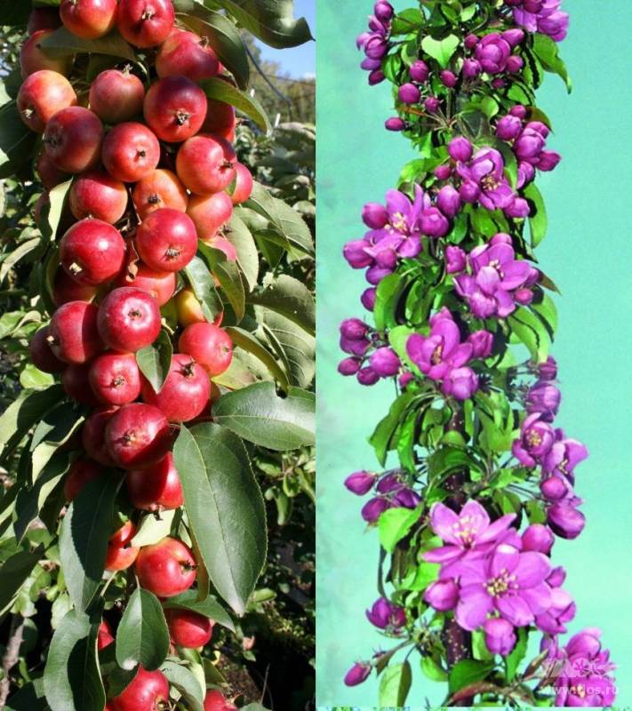 Саженцы яблони декоративной колоновидной Малиновое ожерелье имеют декоративное предназначение. Данное растение формирует колонны средней силы, имеют средний срок цветения. В этот период на яблоне появляются соцветия среднего размера, бутоны красновато-лилового цвета. У этого сорта ветвистость полностью отсутствует, оголений также нет. Крупномер обильно приносит плоды, независимо от погодных условий. Яблоки небольшого размера обладают насыщенным малиново-красным цветом с восковым налетом. На вкус плоды кисло-сладки, вяжущие. Яблоня этого сорта отлично переносит морозы и не нуждается в особенном уходе.